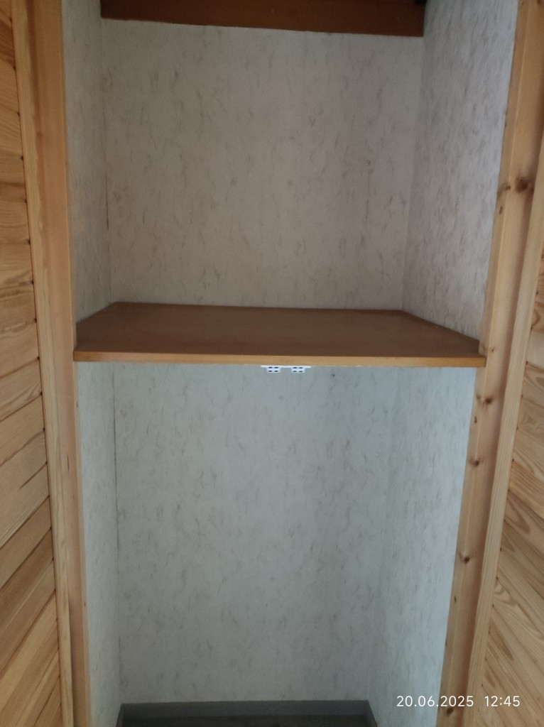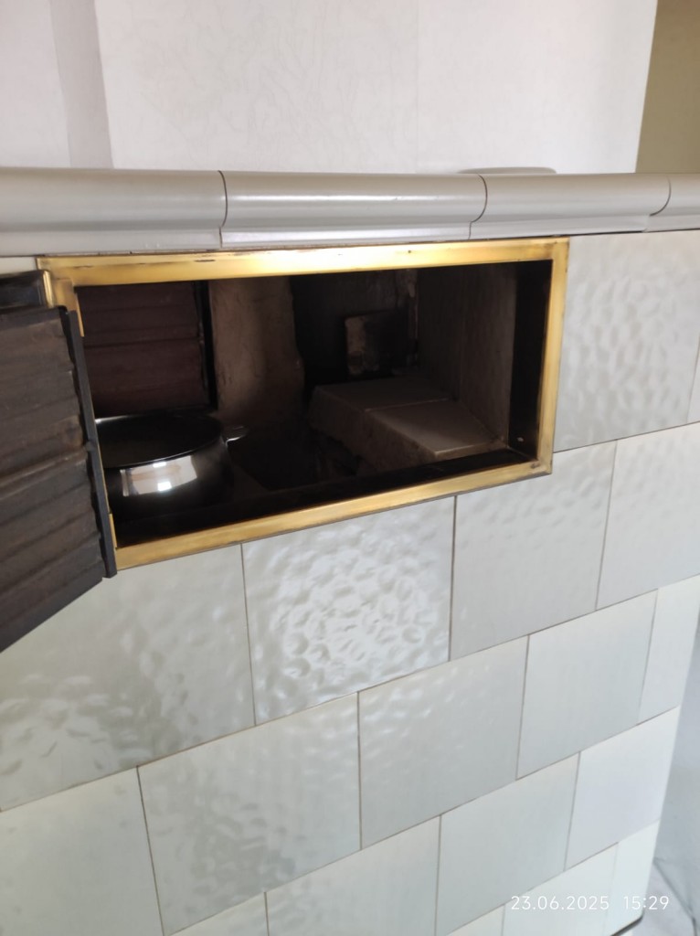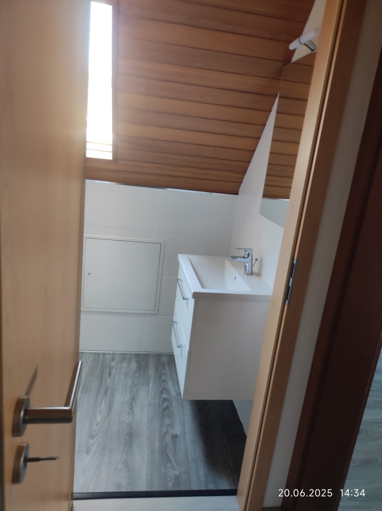 Der Warmluftschacht des Kachelofens führt zu den weiteren Schlafräumen. Das Badezimmer umfasst ein WC, einen Waschtisch und eine Dusche.