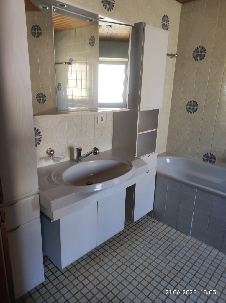 Über das Wohnzimmer, kann die kleine Fliesenterrasse, sowie die Gartenterrasse betreten werden. Der offene Kamin bildet den Mittelpunkt des Raumes. Das Badezimmer verfügt über eine Badewanne, eine Dusche und eine zusätzliche Gasheizung, die alle zwei Jahre geprüft wird.