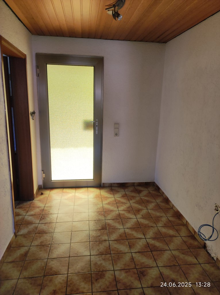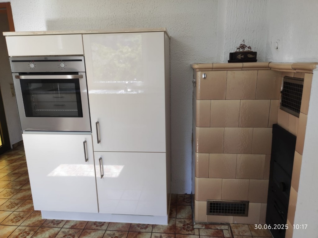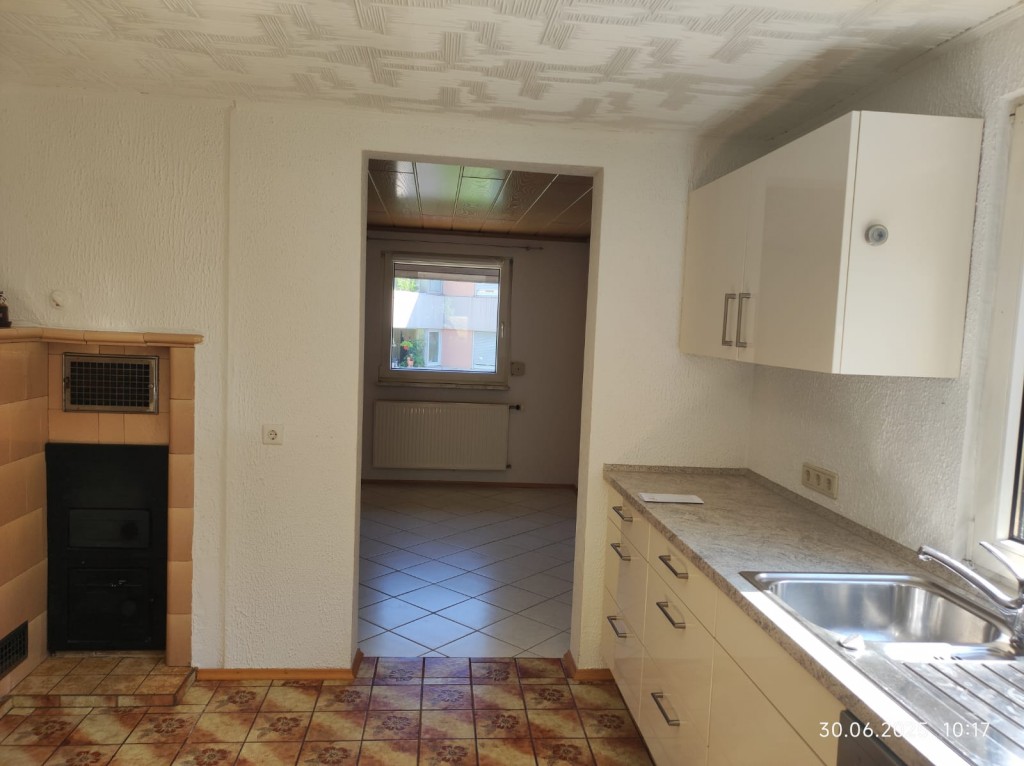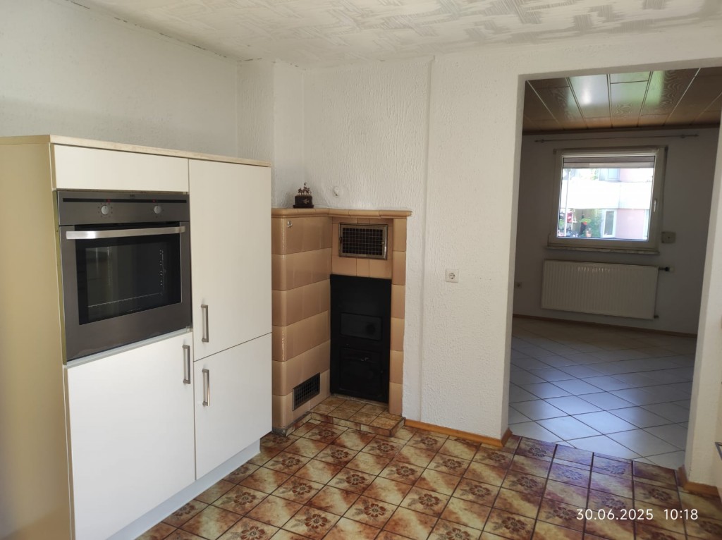 Das Erdgeschoss umfasst ein Badezimmer, ein Esszimmer und eine Einbauküche mit einem Kachelofen, der als unterstützende Heizung genutzt werden kann.